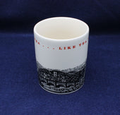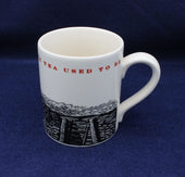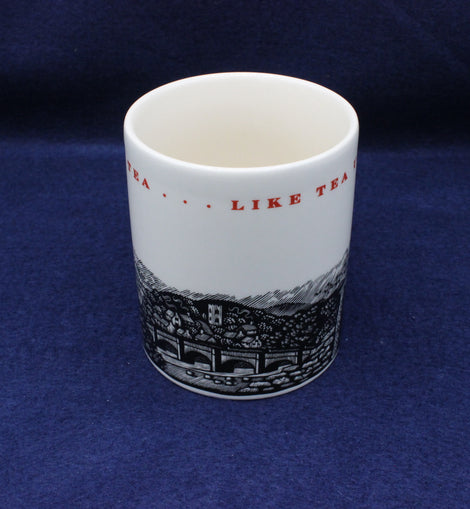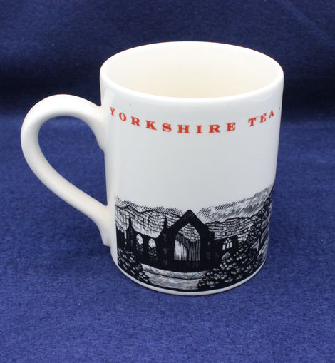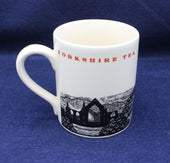 White mug with slogan in red Yorkshire Tea Like Tea Used To Be. Picture wraps around the mug of a wood engraving by Harry Bridgeway. 1993. One of the rarer Yorkshire Tea Mugs.
